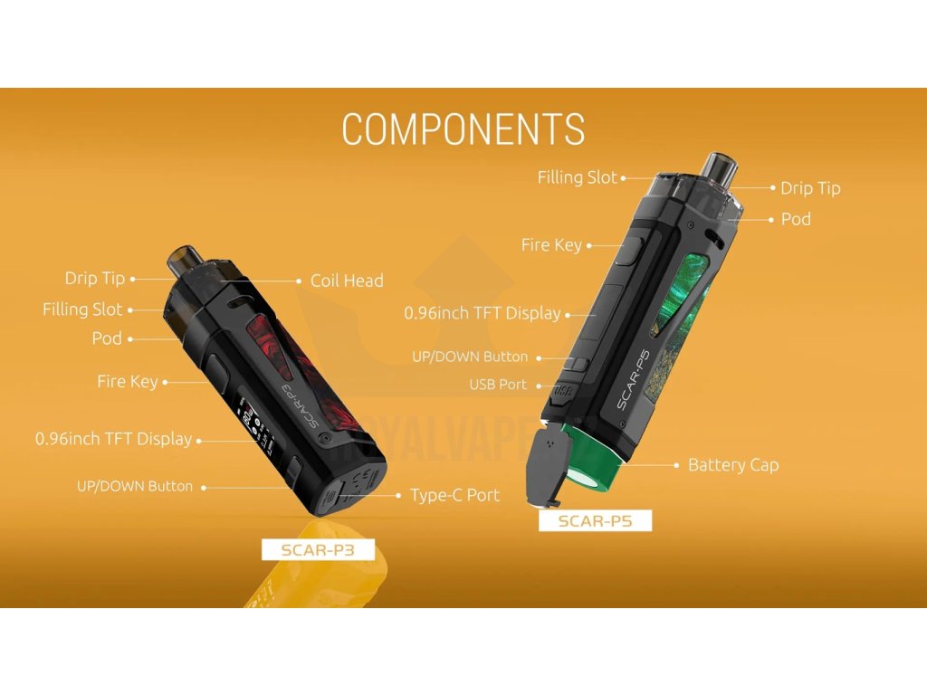 Pod Cartridge sloužící jako zásobník pro Vaší oblíbenou náplň (e-liquid), která v tomto případě slouží zároveň i jako náustek a nosič samotné žhavící hlavy. V případě elektronické cigarety Smok Scar-P5 a P3 se jedná hned o dvě takové Cartridge, o celkovém objemu 5ml, kdy každá je určena pro jiný styl vapování a jinou žhavící hlavu. V jednom případě se jedná o žhavící hlavu s označením RPM Mesh s odporem 0,4Ω, která je vhodná pro MTL styl vapování (jako u klasické cigarety), při doporučeném výkonu 25W, a u druhé se jedná o žhavící hlavu s označením RPM 2, rovněž s mesh spirálkou a celkovým odporem 0,16Ω, která se díky svému nízkému odporu velmi hodí pro DL styl potahování (přímým potahováním do plic). Doporučený výkon pro tuto žhavící hlavu je mezi 25-50W, avšak nejlepšího podání chuti dosahnete při výkonu 40W. Instalace cartridge a žhavící hlavy probíhá pouhým zasunutím, a je tak velmi jednoduchá a zvládne jí bez problémů každý.