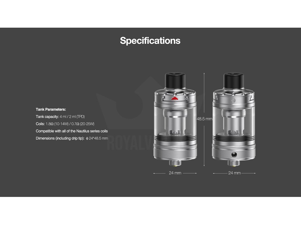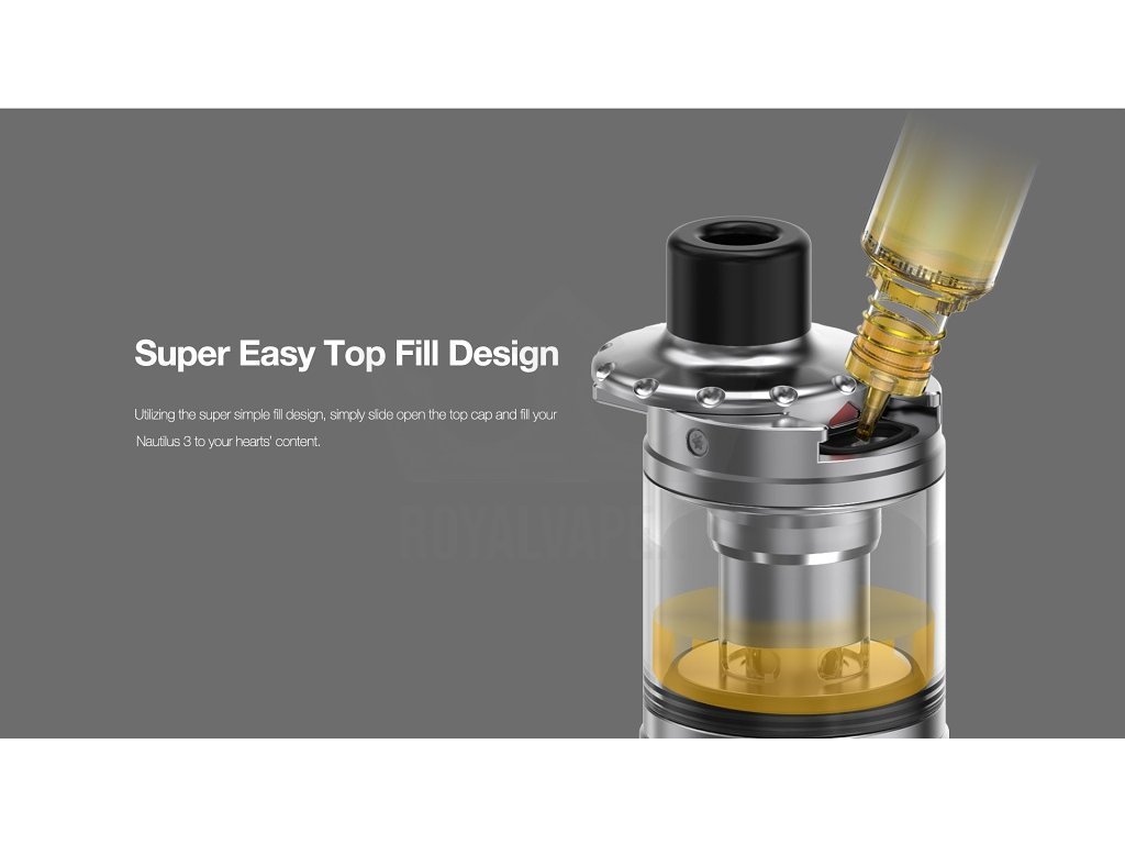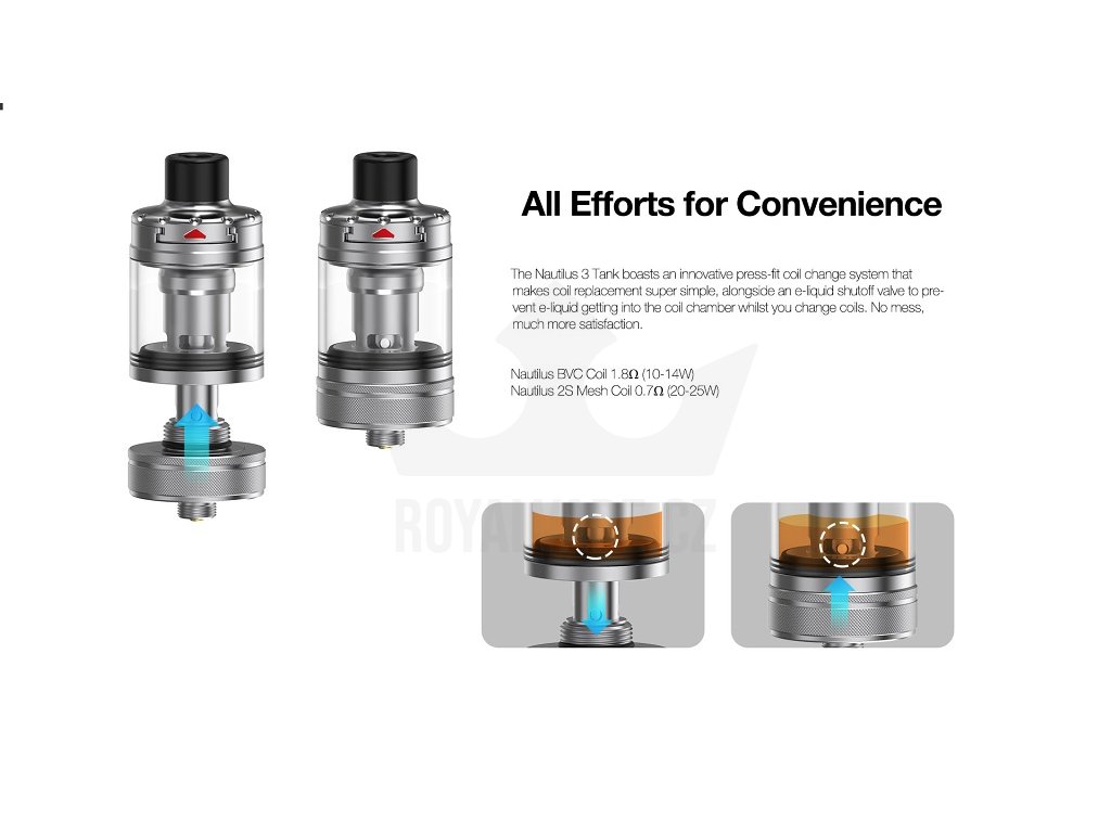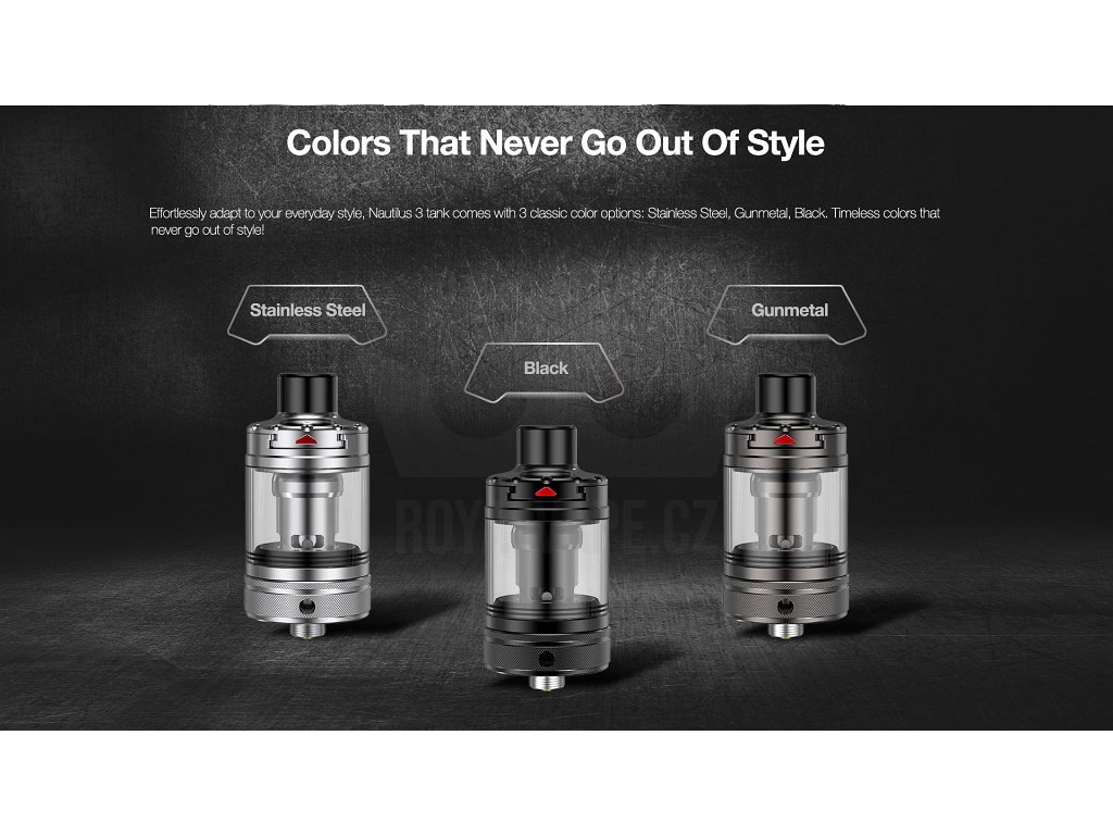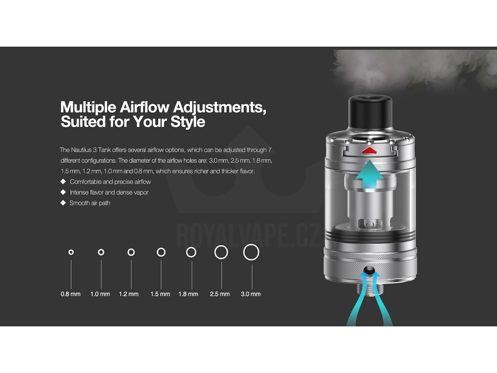Další z řady nástupců legendárních Clearomizérů Aspire Nautilus, tentokrát ve třetí verzi, vyrobený z nerezu a skla o průměru 24mm. Plně kompatibilní se všemi žhavícími hlavami Nautilus. Propracovaný systém přívodu vzduchu (Airflow) 7 stupňů. Vhodný jak pro MTL, tak DL styl vapování. Jednoduché horní plnění e-liquidem. 2x žhavící hlava Nautilus v SETU.