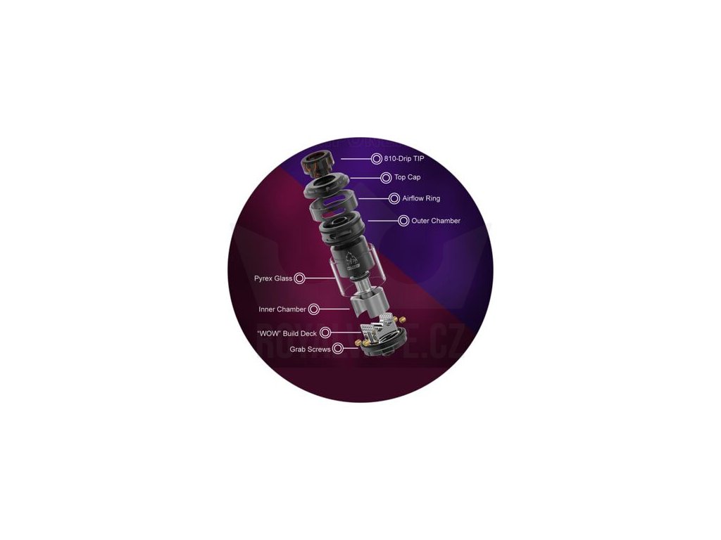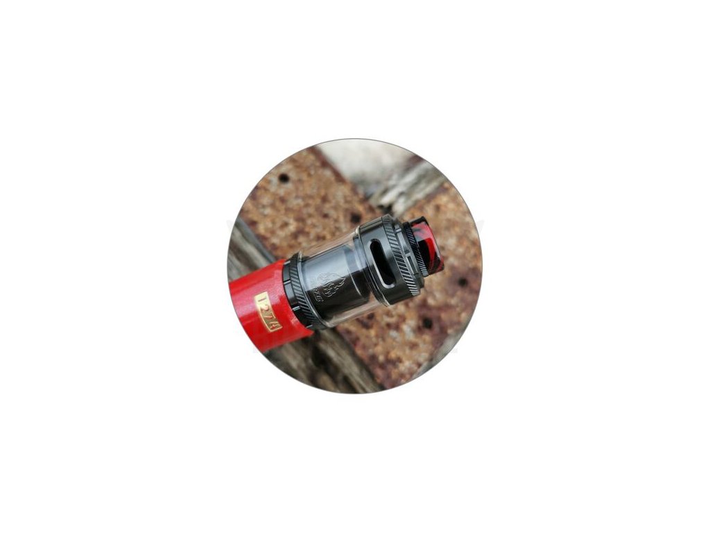 Zajímavým prvkem atomizéru je potom systém airflow. Ten je umístěn ve vrchní části, kde se nachází široký otvor pro vstup vzduchu do atomizéru. Na otvoru najdete praktický regulační kroužek pro pohodlnou regulaci přívodu vzduchu a ovlivnění výsledné tuhosti potahu. Díky vrchnímu přívodu vzduchu navíc vzduch uvnitř atomizéru cirkuluje mnohem efektivněji a výsledná chuť vás doslova dokáže srazit do kolen.