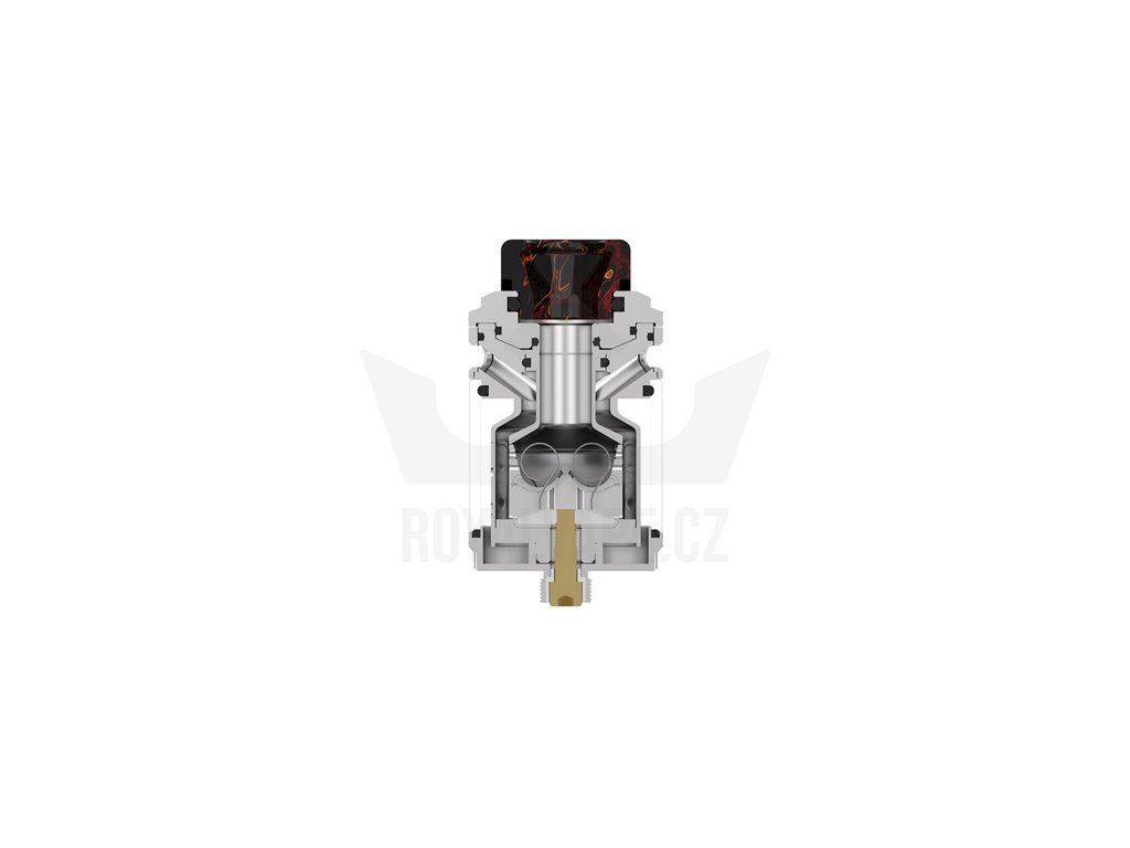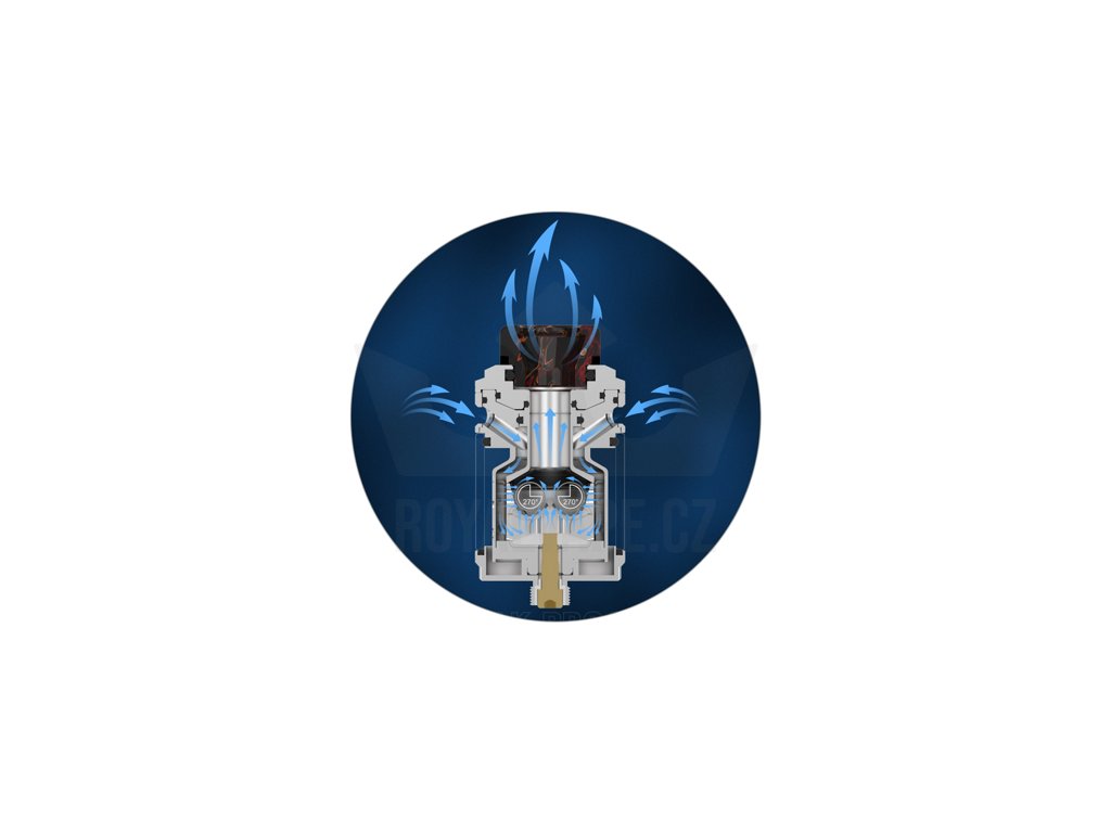 Zajímavým prvkem atomizéru je potom systém airflow. Ten je umístěn ve vrchní části, kde se nachází široký otvor pro vstup vzduchu do atomizéru. Na otvoru najdete praktický regulační kroužek pro pohodlnou regulaci přívodu vzduchu a ovlivnění výsledné tuhosti potahu. Díky vrchnímu přívodu vzduchu navíc vzduch uvnitř atomizéru cirkuluje mnohem efektivněji a výsledná chuť vás doslova dokáže srazit do kolen.