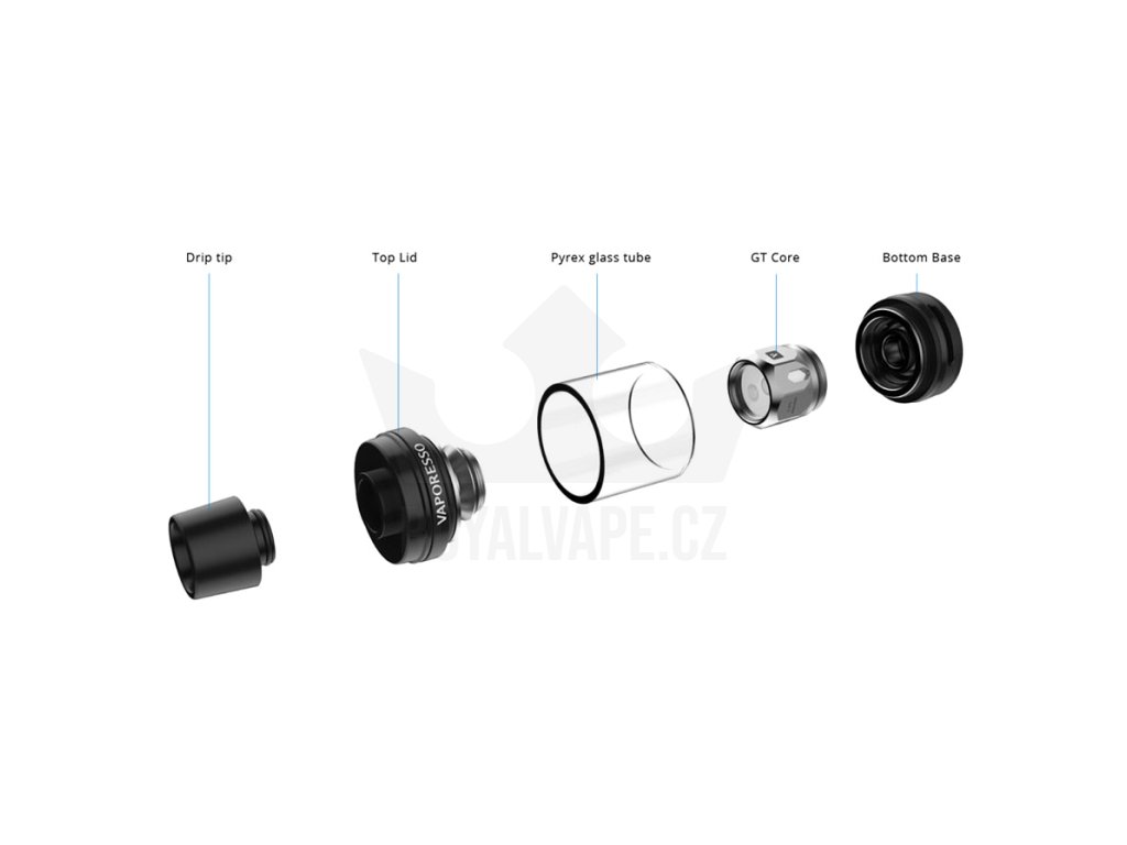 Vaporesso NRG Mini clearomizer o objemu 2ml. Využívá systém horního plnění - po odsunutí vrchní části, plníte liquid otvorem přímo do těla clearomizeru. Celý clearomizer je plně rozebíratelný = snadná údržba. Jeho velkou předností jsou žhavicí hlavy GT, které přináší velkou kouřivost a autentickou chuť liquidu. Žhavicí spirálky jsou obaleny v organické bavlně a zapuštěny do keramického těla. Regulace přívodu vzduchu pro nastavení optimální kouřivosti se nachází ve spodní části.