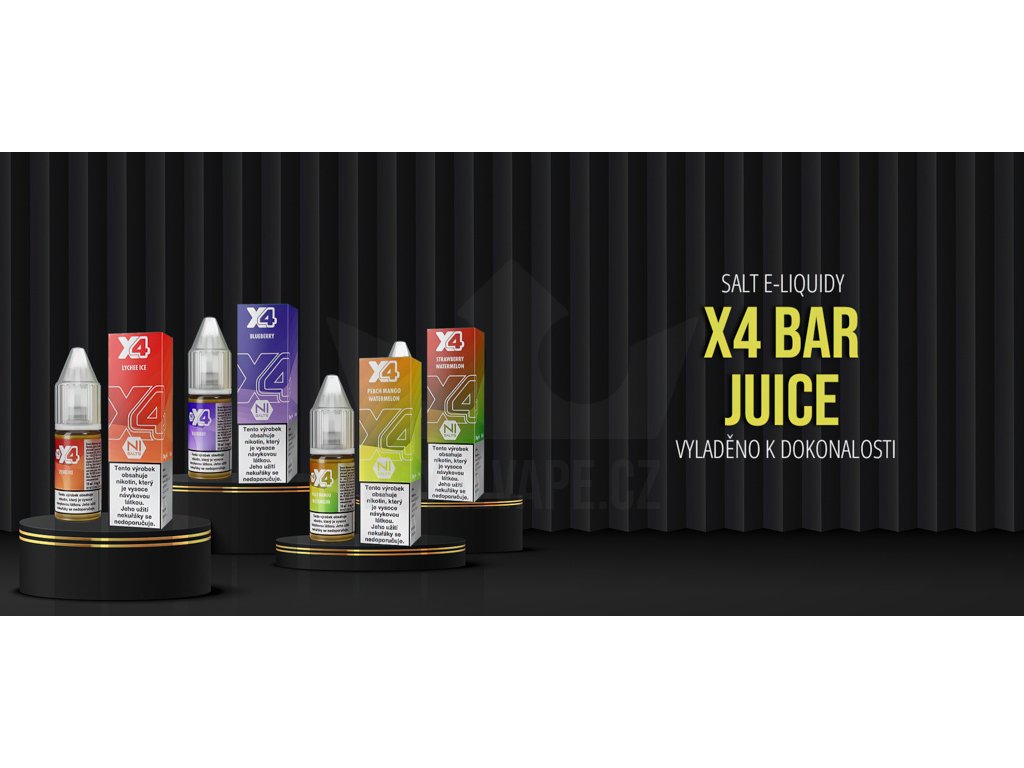 Hlavní předností náplní do elektronických cigaret značky X4 Bar Juice je to, že obsahují dnes velmi oblíbenou nikotinovou sůl (Nic.Salt) a jejich neskutečně věrného podání chuti, což přináší ještě hlubší požitek z vapování. Každá jednotlivá příchuť je pečlivě propracovávána do posledního detailu, dokud není dosaženo požadované věrnosti. E-liquidy X4 Bar Juice přichází v mnoha dokonale vyladěných příchutí, což ocení hlavně vyznavači ovocných nápojových příchutí.