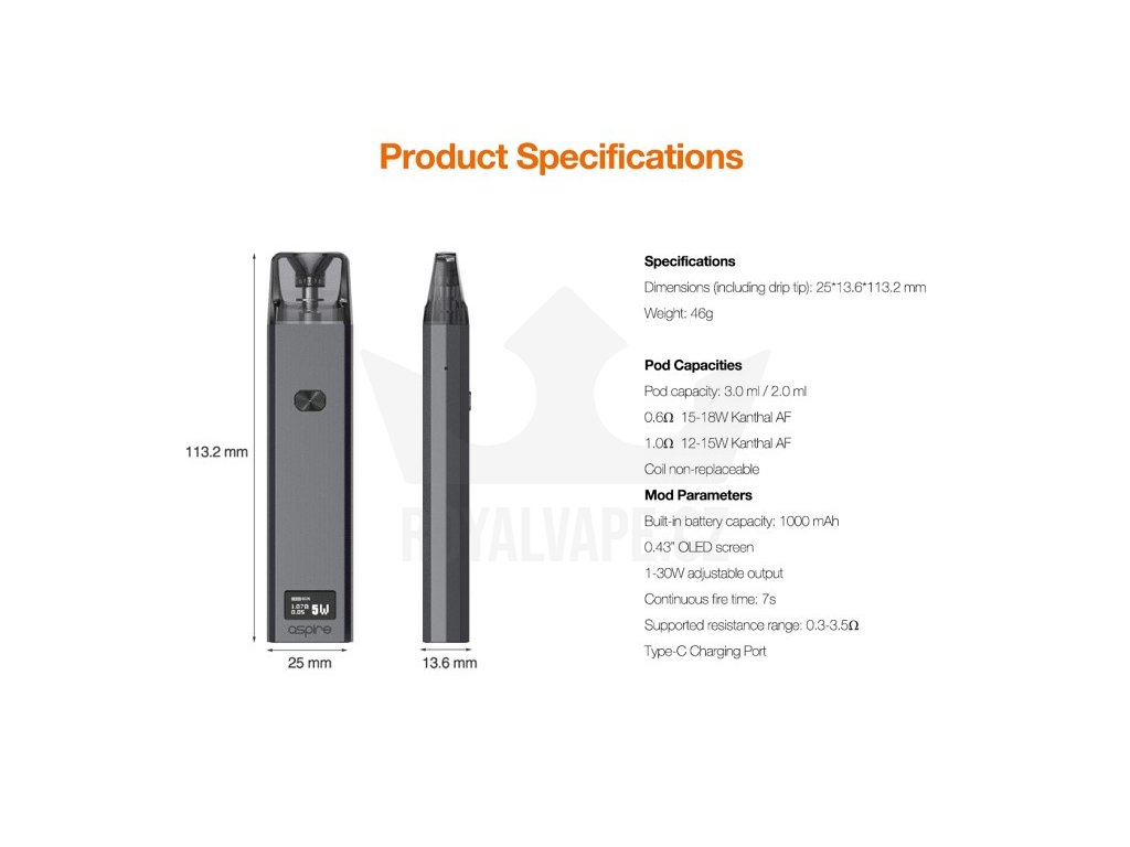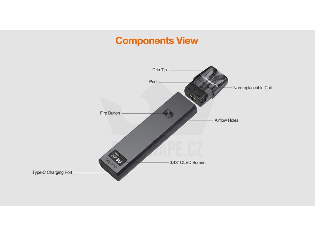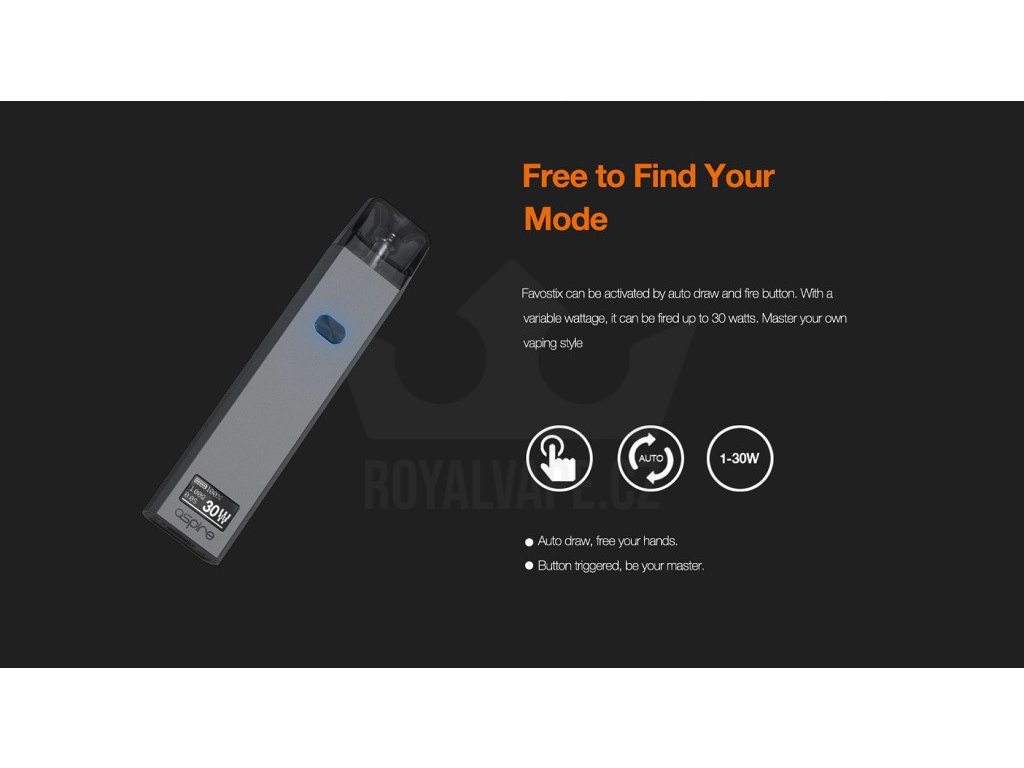 Elegantní Pod elektronická cigareta vyrobená z hliníkové slitiny. Velmi vhodná pro náplně s nikotinovou solí a podporou RDTL i MTL potahování, OLED displej, automatický i manuální aktivace potahu, výkon až 30W, baterie 1000mAh, USB-C nabíjení, plnitelné Pod Cartridge Aspire Favostix.