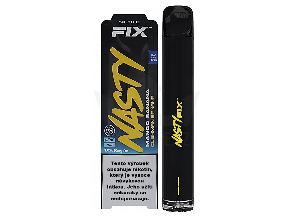 Svěží a tropická chuť oblíbeného manga s porcí zralých exotických banánů. Nasty Juice Air Fix je jednorázová elektronická cigareta obsahující 2 ml předplněného e-liquidu uvedené příchutě. Obsahuje nikotinovou sůl, která se rychleji vstřebává do těla a není tak nutné časté potahovaní, jako je tomu klasických liquidů. Cigareta je napájena vestavěnou baterií o kapacitě 700 mAh, se kterou dosáhnete až 675 potažení. Spodní část zařízení disponuje regulací přívodu vzduchu pro optimální nastavení kouřivosti. Jde o ideální řešení pro kuřáky, kteří potřebují jednorázově překlenout pobyt v nekuřáckém prostředí. Obsah nikotinu 10mg/1ml.
