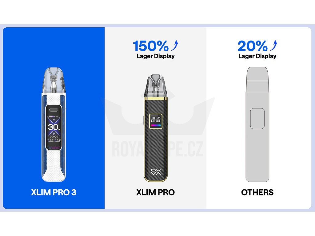 OXVA XLIM Pro 3 představuje vlajkovou loď mezi kompaktními pod systémy s 1,05" HD barevným displejem, který nabízí kristálně čistý přehled všech důležitých informací na jediný pohled. Toto prémiové vape zařízení kombinuje profesionální výkon s intuitivním ovládáním a nabízí regulovatelný výkon až 30 wattů spolu s integrovanou baterií o kapacitě 1500 mAh. Jako nástupce oblíbeného XLIM Pro 2 přináší výrazně větší displej, pokročilejší menu systém a duální způsob aktivace - jak automatické senzorové spouštění při potažení, tak klasické tlačítkové ovládání. Revoluční Pulse System s inteligentním Photon čipsetem zajišťuje stabilní výkon a udržuje konzistenci chuti na úrovni 80% i při pouhých 20% nabití baterie, zatímco technologie UniTech 2.0 prodlužuje životnost podů o 30% a zvyšuje intenzitu chuti až o 50% oproti starším verzím. Zařízení je kompatibilní s celou řadou XLIM podů včetně V2, V3 a EZ Cartridgí. S rozměry 119,9 x 25,7 x 15,0 mm a hmotností přibližně 77 gramů nabízí XLIM Pro 3 ideální rovnováhu mezi kompaktností a výkonem pro každodenní použití.