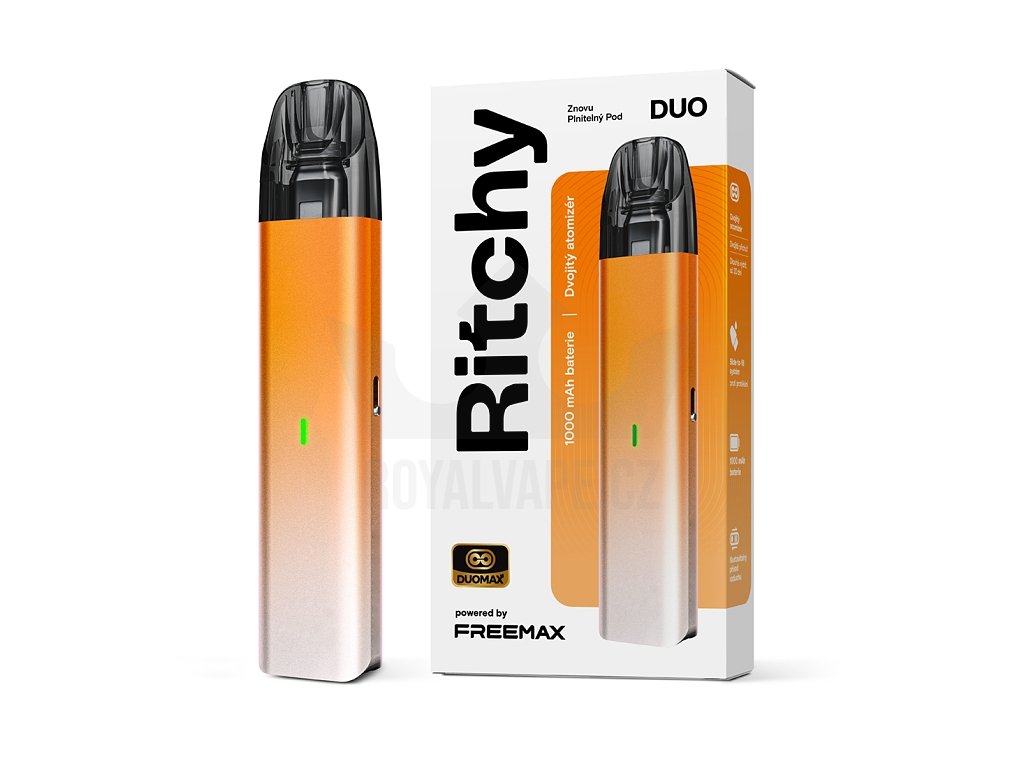 RITCHY DUO POD představuje revoluci ve světě vapingu s exkluzivní technologií DUOMAX Parallel Double Mesh, která jako první na světě využívá skutečné paralelní dvojité mesh žhavení v kompaktním pod systému. S kapacitou baterie 1000 mAh a výstupním výkonem až 28 wattů nabízí tato elegantní elektronická cigareta dlouhotrvající a spolehlivý výkon při každém potáhnutí. Inovativní DUOMAX technologie s paralelními dvojitými mesh cívkami zvyšuje intenzitu chuti až o 300% a prodlužuje životnost podu až 3x oproti běžným single mesh systémům. Více než dvojnásobná plocha ohřevu ve srovnání s vertikálními dual mesh systémy zajišťuje rovnoměrné zahřívání, vyšší stabilitu a nepřekonatelnou konzistenci chuti. RITCHY DUO POD kombinuje moderní design s pokročilou technologií v kompaktních rozměrech 114 x 24 x 14 mm a hmotnosti pouhých 44 gramů. Zařízení je kompatibilní s celou řadou DUO a DUOMAX Pod Cartridgí s odpory 0,4Ω a 0,6Ω.