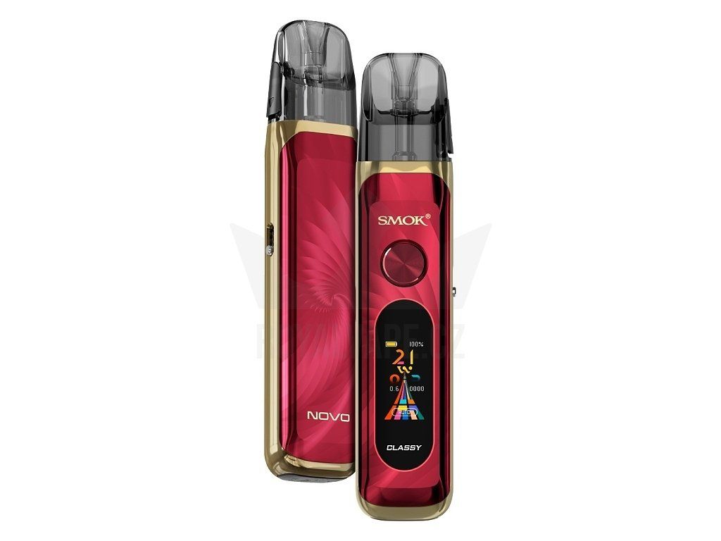 SMOK Novo Classy je kompaktní pod systém nové generace, který dokazuje, že elegance a výkon jdou ruku v ruce. Rám přístroje je vyroben ze slitiny zinku s texturovaným IML povrchem, do něhož jsou jemně vylisovány spirály zlatého řezu – výsledkem je zařízení, které se nejen skvěle drží v ruce, ale také na sebe okamžitě upozorní svým prémiový vzhledem. Přístroj pohání integrovaná baterie s kapacitou 1350 mAh, která zvládne pokrýt celodenní provoz bez nutnosti dobíjení. Maximální výstupní výkon dosahuje 35 W, přičemž o přehledné zobrazení stavu zařízení se stará barevný 0,96" TFT HD displej se šesti přizpůsobitelnými motivy uživatelského rozhraní. Disponibilní jsou dva inteligentní pracovní režimy: Auto mód pro automatické nastavení výkonu dle detekovaného odporu a Memory mód, který si pamatuje naposledy nastavenou wattáž. Součástí balení jsou dvě NOVO Pod CLX Cartridge o objemu 2 ml (EU verze) s meshovými žhavícími prvky 0,6 Ω a 0,8 Ω, vhodné pro styl potahování MTL i RDL. Plnění e-liquidu je řešeno praktickým topside systémem přímo na boku Pod Cartridge.