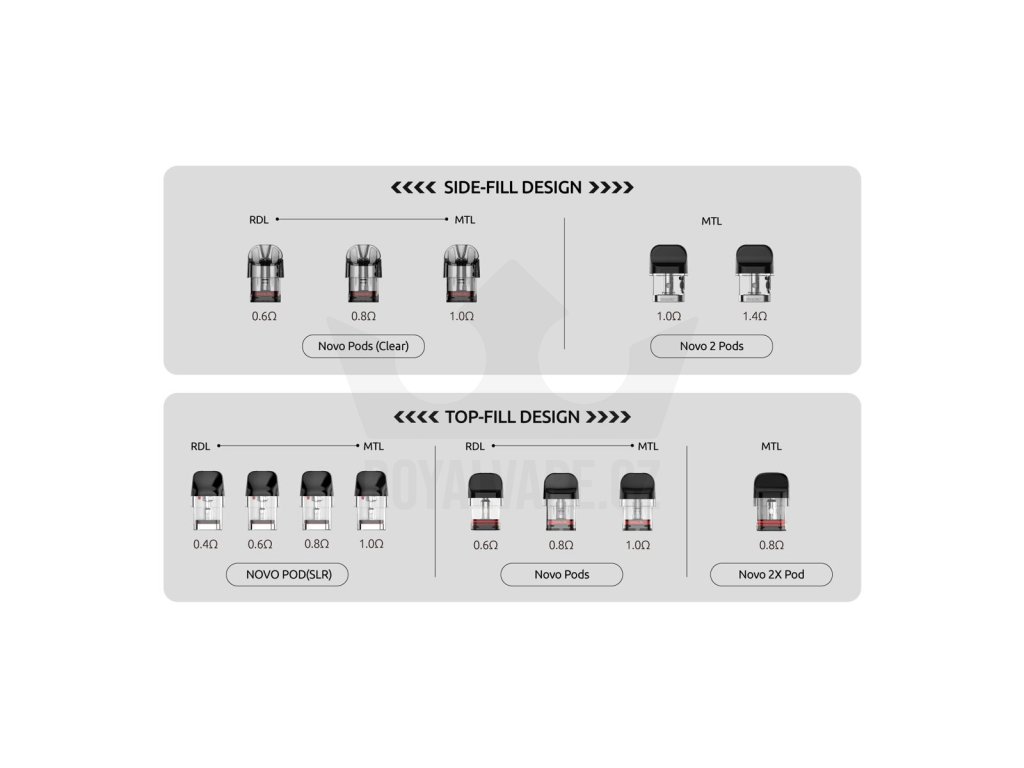 Platforma NOVO nabízí obrovskou škálu náhradních cartridgí, jejichž hlavní předností je to, že jsou vzájemně kompatibilní. Vybírat můžete z různých typů s bočním či horním plněním, mesh pletivo i tradiční spirálku. Všechny dokáží zprostředkovat velice autentickou chuť vašeho oblíbeného e-liquidu. Široký rozsah dostupných odporů pro MTL a RDL vaping uspokojí většinu vaperů.