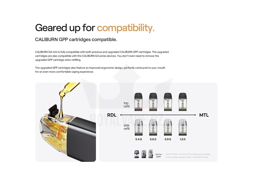 Caliburn G4 Mini Pod Kit vyniká především svojí uživatelskou přívětivostí a pokročilými funkcemi zabalenými do elegantního minimalističtého těla. Cartridge Uwell Caliburn GPP s objemem 3ml a odporem 0,6Ω poskytuje vynikající chuťový výkon díky upgradované technologii PRO-FOCS 4.0, která výrazně zlepšuje jak intenzitu chuti, tak životnost žhavících hlav. Inovativní systém plnění s horní silikonovou záslepkou umožňuje snadné doplňování e-liquidu bez nutnosti odpojování cartridge od baterie. USB-C port s parametry 5V/1A zajišťuje rychlé a spolehlivé nabíjení integrované baterie. Duální regulace airflow kombinuje manuální ovládání pomocí boční páčky s možností otočení podu pro jemné doladění tuhosti potahu. Toto zařízení je ideální volbou pro uživatele, kteří hledají spolehlivou elektronickou cigaretu s prémiovou konstrukcí, vynikající chutí a nenáročnou obsluhou. Elegantní zpracování a rozmanitá barevná paleta činí z Caliburn G4 Mini nejen funkční, ale i stylový doplněk pro každodenní vapování.