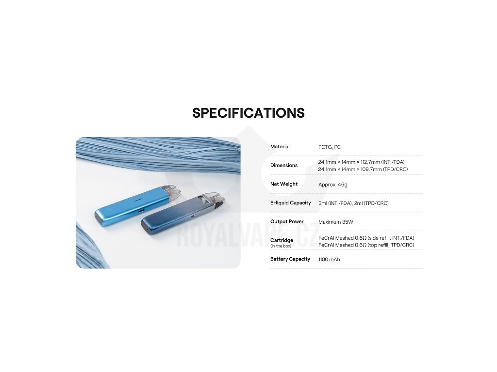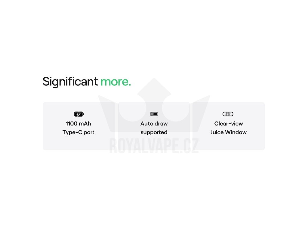 Parametry a specifikaceRozměry: 112,7 x 24,1 x 14 mm Kapacita baterie: 1100 mAh Režimy: Automatický režim VW Metody spínání potahu: Automatické Výstupní výkon: až 35W (automatický) Podporovaný odpor: dle cartridge Způsob nabíjení: USB-C port (5V / 1A) Regulace výkonu: Automatická Objem Pod Cartridge: 3 ml Styl potahování: MTL / RDL Odpor žhavících hlav v balení: 0,6 Ω Regulace přívodu vzduchu (Airflow): Ano Hmotnost: 46 g Barva: Night Black (Černá) Materiál: PC + PCTG |