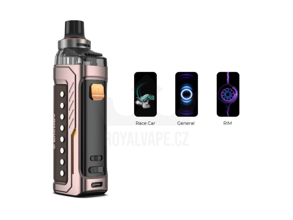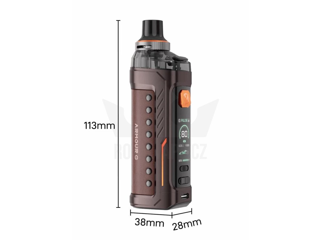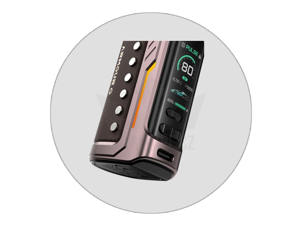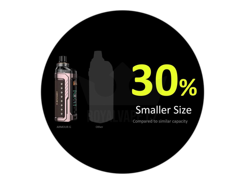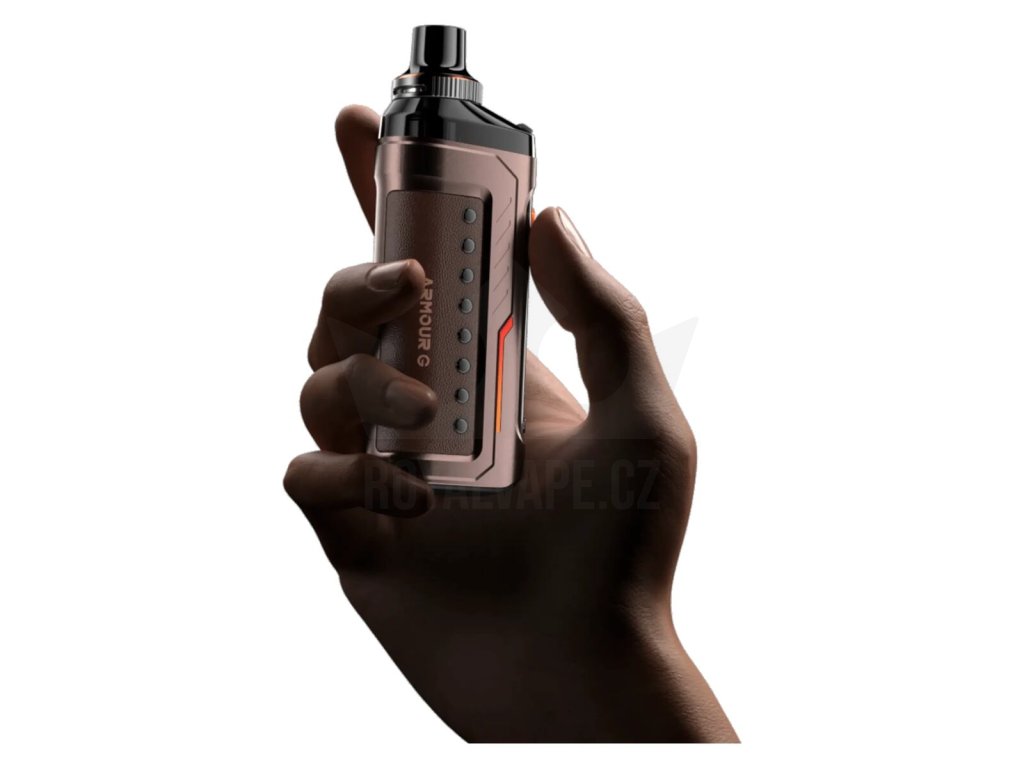 Luxusně zpracovaný pod mod Armour G se pyšní bytelnou kovovou konstrukcí a krásně zpracovanými koženými panely. Nabídne také perfektní ergonomii pro pohodlné držení v dlani během používání. Zadní zaoblená část krásně kopíruje vaši dlaň a vapování vás tak bude doslova bavit. Oproti jiným pod modům s podobnými vlastnostmi navíc nabídne až o 30% menší konstrukci, celkové rozměry se zastavily na krásných 113 x 38 x 28 mm.