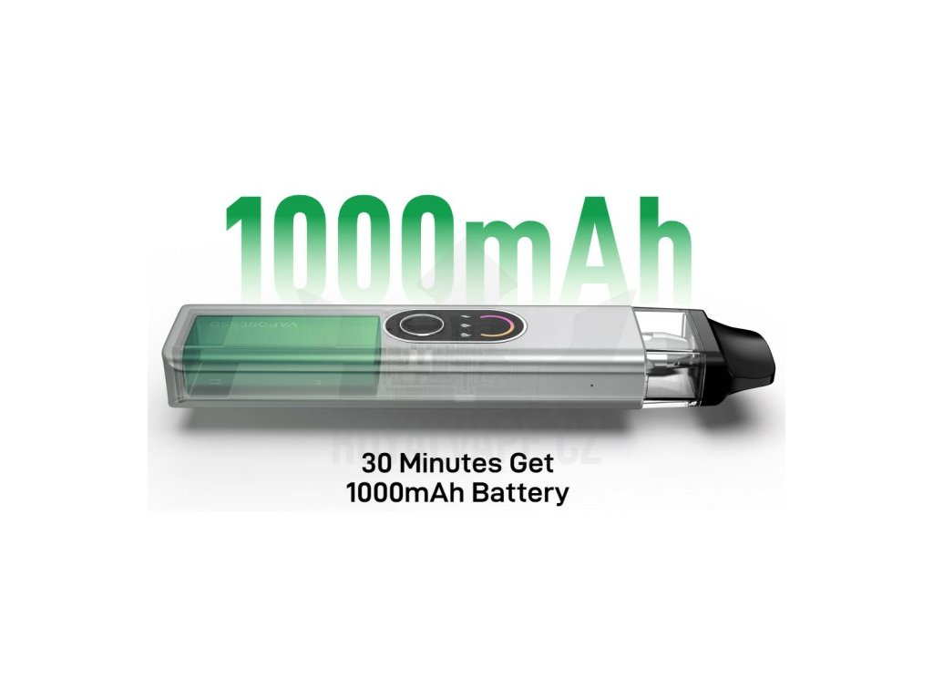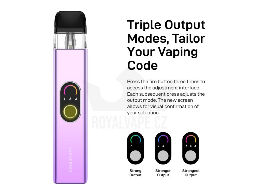 Oblíbenost elektronických cigaret XROS od Vaporessa stále strmě stoupá vzhůru. Proto se výrobce rozhodl představit již čtvrtou řadu tohoto prvotřídního zařízení s technologií Corex Heating Tech pro konzistentní chuť liquidu. Tělo baterie je vyrobeno z kvalitní hliníkové slitiny, které obsahuje monočlánek o kapacitě 1000mAh s USB-C nabíjením a moderním AXON čipem. Na přední straně baterie se nachází spínací tlačítko a přehledný displej, který Vás informuje o stavu nabití baterie a umožním vám nastavení výstupního režimu. Vyměnitelná cartridge XROS o objemu 3ml je kompatibilní se všemi modely této řady. Na vrchní straně baterie je umístěna důmyslná regulace přívodu vzduchu zajišťující skvělou dýmivost a autentickou chuť liquidu.