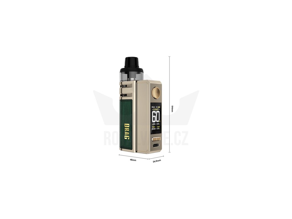 VooPoo Drag E60 Pod Kit je praktická a kompaktní e-cigareta, která zaujme nejen kapesními rozměry, ale také nabušenými funkcemi. Hlavní výsadou jsou však právě tyto rozměry, díky kterým ji snadno uložíte do kapsy a v dlani ji během užívání ani neucítíte. Rozměry těla činí 94 x 46 x 24,9 mm, k dostání je v šesti barvách s konstrukcí z kombinace zinkové a hliníkové slitiny s ekokoženým potahem v zadní části.
