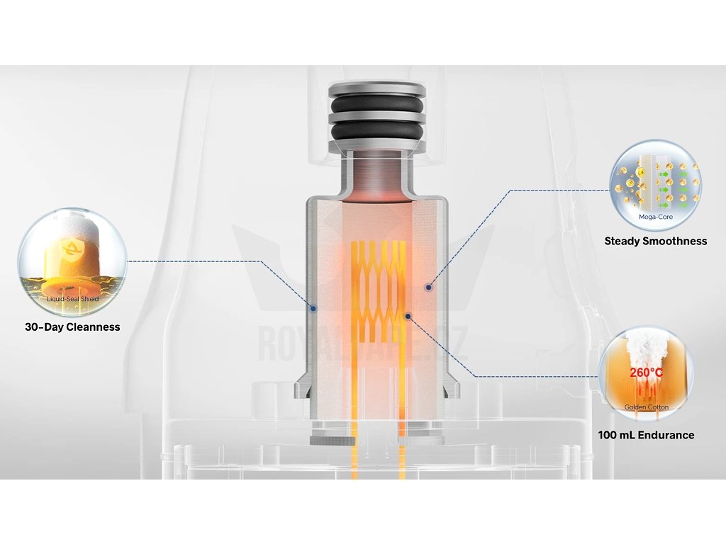 Žhavící hlavyIntegrovaná mesh spirálka z kanthalu s odporem 0,8Ω zajišťuje jemný MTL styl vapování s výborným chuťovým podáním a konzistentním výkonem. Mesh technologie poskytuje větší povrch pro ohřev e-liquidu a intenzivnější chuť. Systém podporuje odpory v rozsahu 0,3Ω až 3Ω pro širokou variabilitu. |