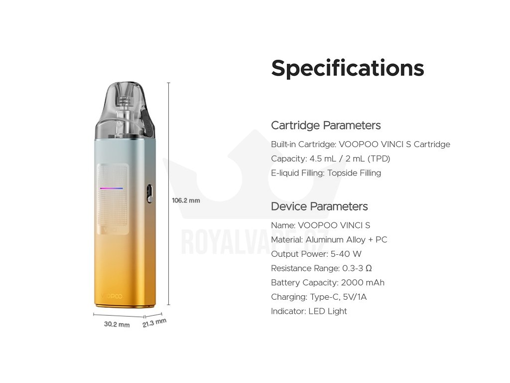 Technologie iCOSM CODE 2.0 představuje vylepšený systém prevence proti protékání a zajišťuje optimální distribuci e-liquidu ke spirálce pro dokonale plynulý a stabilní výkon po celou dobu používání. Každý potah je tak stejně intenzivní a chuťově bohatý od prvního až po poslední. Vinci S nabízí výjimečnou kompatibilitu s více typy Pod Cartridgí, kromě přibaleného Vinci S podu můžete využívat také Vinci E pody v odporech 0,3Ω, 0,6Ω a 0,8Ω, stejně jako PnP-X cartridge s vyměnitelnými žhavícími hlavami, což vám poskytuje širokou škálu možností pro přizpůsobení vapování vašim preferencím. V balení naleznete 2ml Pod Cartridge s integrovanou mesh spirálkou 0,8Ω, která je optimalizována pro jemný MTL styl vapování s výborným chuťovým podáním. Plnění podu je maximálně jednoduché díky horní silikonové krytce, kterou otevřete bez nutnosti vyjímání podu ze zařízení. Plynule nastavitelný přívod vzduchu umožňuje přesné doladění volnosti potahu podle vašich individuálních požadavků, od těsnějšího MTL až po volnější RDL styl. LED indikátor vás průběžně informuje o stavu nabití baterie, takže nikdy nebudete zaskočeni vybitím. VOOPOO Vinci S je dokonalým řešením pro vapery hledající elegantní, bezstarostné a spolehlivé zařízení s prémiovou kvalitou zpracování a vynikajícím chuťovým projevem.
