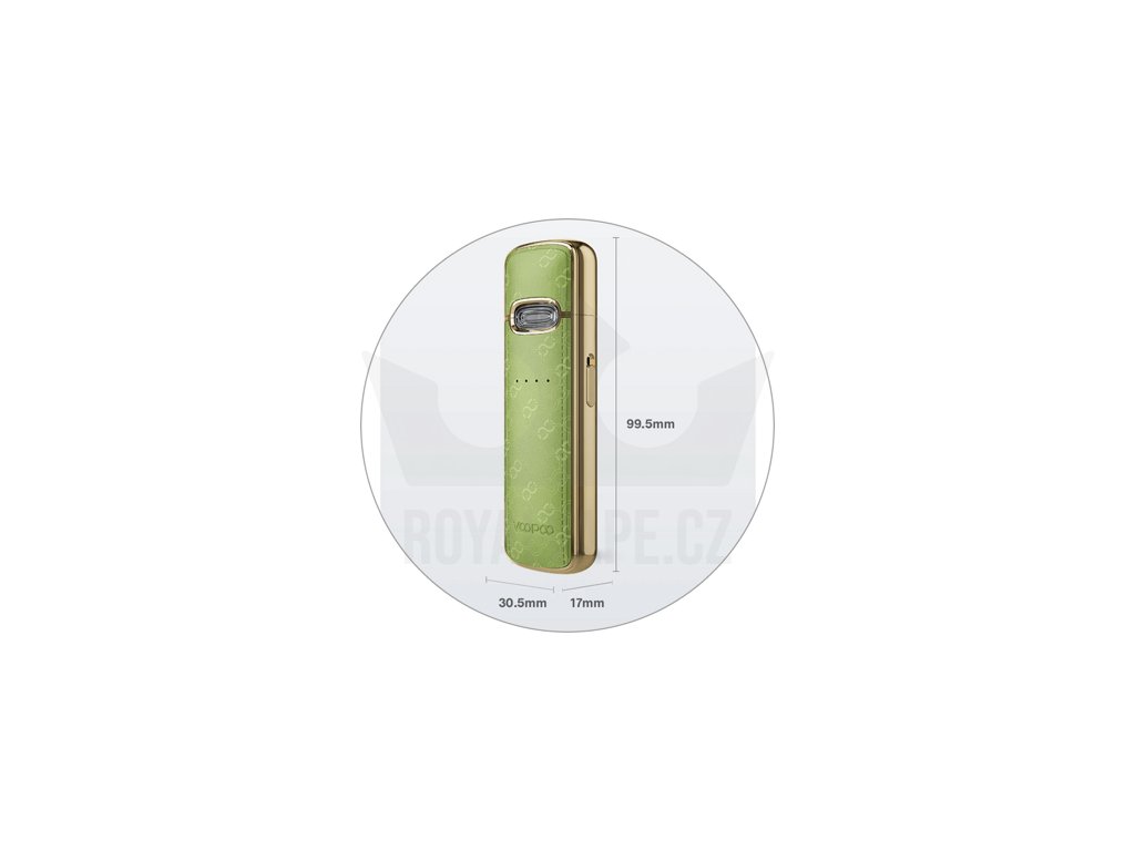 VooPoo VMATE E Pod Kit je nádherně zpracovaná a stylová e-cigareta, která přichází na scénu hned v šesti barvách. Tělo je vyrobeno z kombinace zinkové slitiny a kůže, na výběr budete mít ze tří konvenčních barev s šedou konstrukcí, nebo tři moderní a luxusní barvy s pozlacenou konstrukcí. Rozměry e-cigarety činí krásných 99,5 x 30,5 x 17 mm, díky čemuž se bude příjemně držet v ruce při každodenním používání.