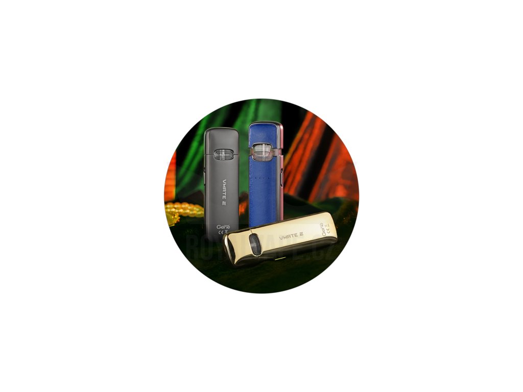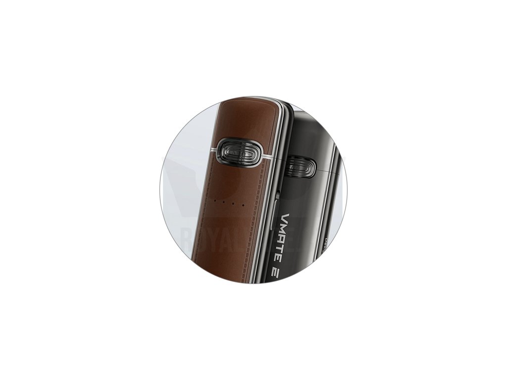 VooPoo VMATE E Pod Kit je luxusně zpracovaná e-cigareta pro klasické šlukování, která nádherně doplňuje celou sérii VMATE. Jedná se o zajímavý model zejména z hlediska estetiky, nabídne však také velice solidní parametry v čele s velkou kapacitou baterie, díky čemuž si její používání velice snadno oblíbíte. Samotné tělo je vyrobeno z kombinace zinkové slitiny a kůže. K dostání je ve třech barvách s tradiční šedou konstrukcí, nebo ve třech barvách pro náročnější, které nabídnou kovovou konstrukci s pozlaceným povrchem pro co nejstylovější vzhled. Rozměry těla činí 99,5 x 30,5 x 17 mm, díky svému ergonomickému zpracování a kompaktním rozměrům padne e-cigareta perfektně do ruky a pohodlně se užívá. Hlavní výsadou je potom speciální krytka náustku ve vrchní části, která zabraňuje vniknutí nečistot při cestování, nebo při každodenním používání, do samotného náustku. E-cigaretu tak můžete neustále udržovat v čistotě a užívat si pohodový vaping naprosto kdykoliv.