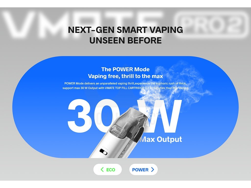 Duální režimyManuální přepínač na předním panelu umožňuje snadné přepínání mezi režimem POWER s regulací výkonu 5-30W a úsporným ECO režimem s automatickým nastavením. ECO režim optimalizuje spotřebu baterie při zachování výborného vapovacího zážitku. |