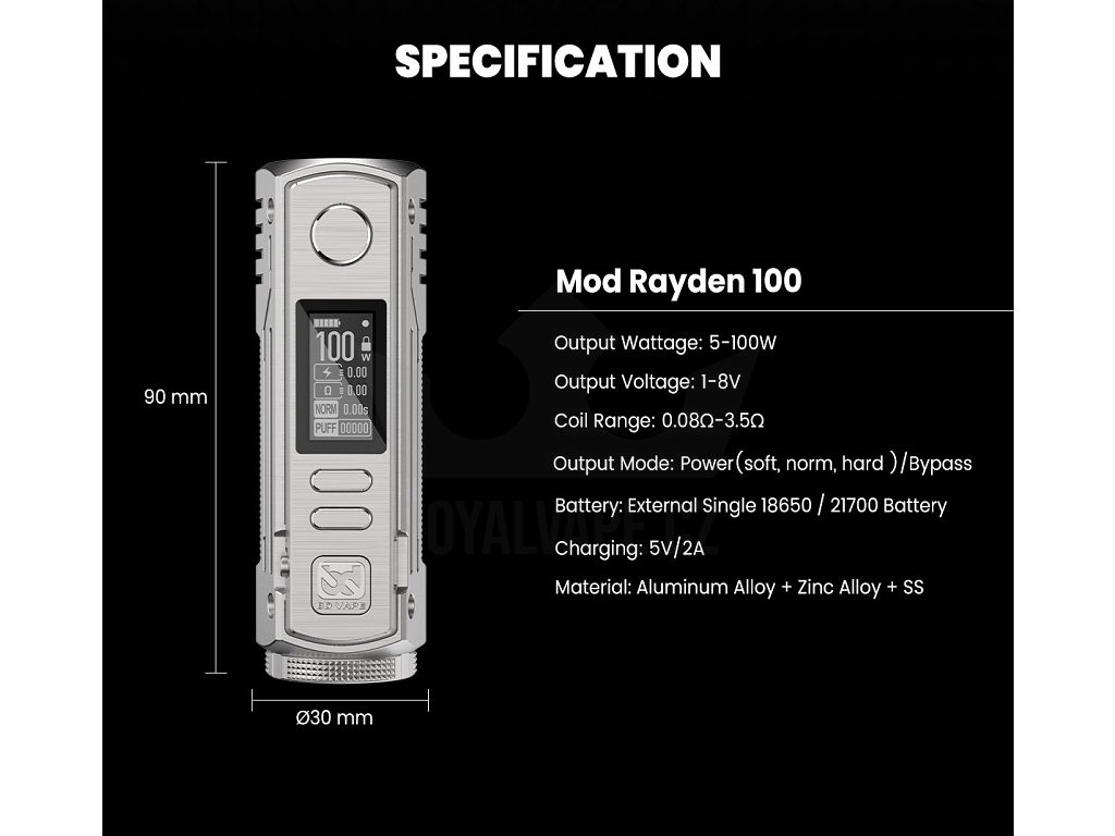 Flexibilní baterieBD Vape Mod Rayden 100 V2 podporuje baterie 18650 i 21700. Pro vyšší výkony doporučujeme články s vybitím alespoň 25A pro optimální bezpečnost a výkon. |