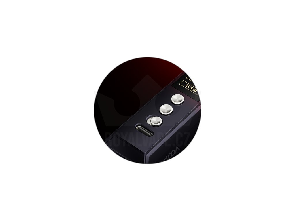 V těle modu najdete slot pro vložení jedné externí baterie. Mod pracuje s bateriemi typu 21700, případně s klasickými bateriemi 18650 po použití adaptéru. Díky slotu pro externí baterii nabídne mod svobodu při výběru vlastního specifického článku pro co nejlepší výsledky při vapování. Samozřejmostí je potom také podpora rychlého nabíjení baterie přímo uvnitř modu, stačí jen připojit USB-C kabel a začít dobíjet proudem až 2.5 A.