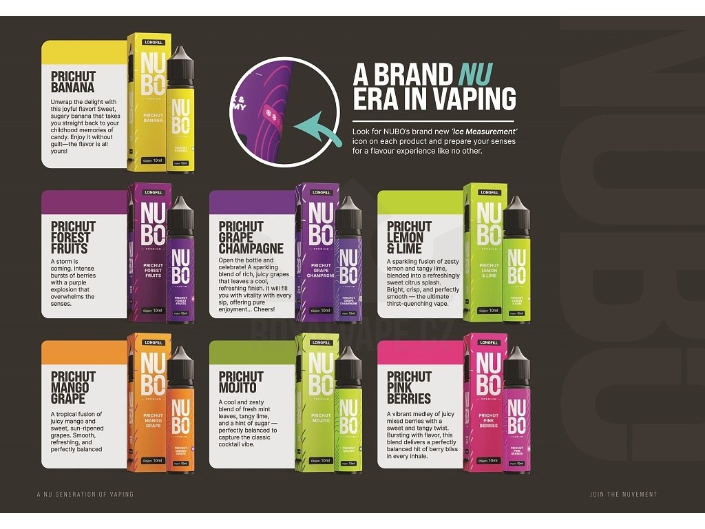 NUBO Premium příchutě se vyznačují revoluční technologií "Ice Measurement", která je graficky znázorněna na každém obalu a informuje vás o intenzitě chladivého efektu dané příchuti. Tento inovativní přístup vám umožňuje předem vědět, jaký senzorický zážitek můžete očekávat - od jemně osvěžujících až po intenzivně ledové příchutě. Kolekce zahrnuje pestrou škálu chutí: Banana (sladká banánová nostalgie), Forest Fruits (intenzivní lesní ovoce s purpurovým charakterem), Grape Champagne (šumivá elegance hroznů), Lemon & Lime (osvěžující citrusová exploze), Mango Grape (tropická fúze), Mojito (klasický koktejlový zážitek) a Pink Berries (šťavnatá směs červených plodů). Všechny příchutě jsou vyrobeny na bázi propylenglykolu (E1520) s prémiovou aromatickou složkou, což zajišťuje čistou chuť bez nežádoucích příměsí. Ideální doba zrání je 2-4 dny, není však nutná pro okamžité použití. Belgická společnost NUBO klade důraz na transparentnost, bezpečnost a spokojenost zákazníků, což se odráží v každém aspektu jejich produktů. Ať už jste začátečník nebo zkušený vaper, NUBO Premium vám nabízí perfektní rovnováhu mezi kvalitou, cenou a chuťovým zážitkem, který vytváří nové standardy pro Shake & Vape příchutě na evropském trhu.
