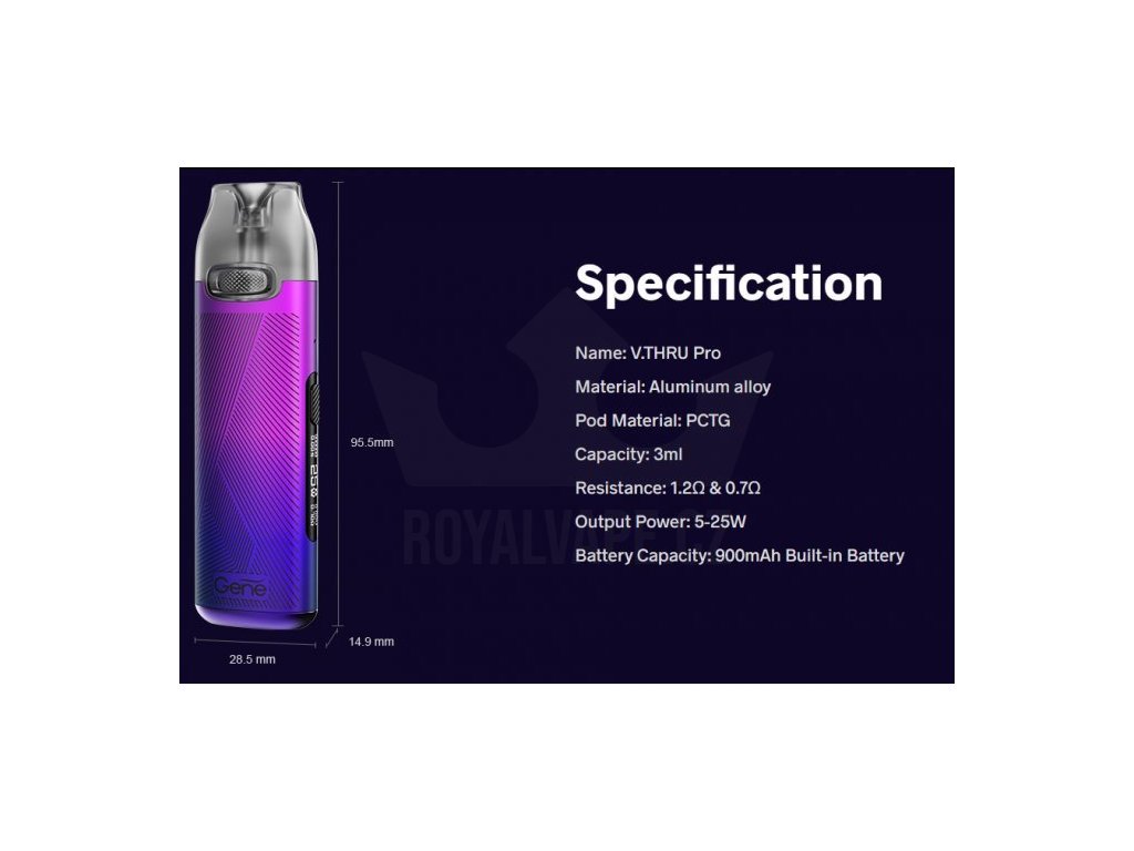 Není určeno pro náplně obsahující nikotin! Elektronická cigareta VOOPOO V.THRU Pro připomíná na první pohled svými rozměry legendární Joyetech Teros, ale svými vlastnostmi je tento kousek absolutní špičkou mezi POD systémy. Odlehčené tělo e-cigarety disponuje vestavěnou baterií o kapacitě 900mAh, automatickým spínačem, nastavitelným výkonem od 5W do 25W a 0,69 palcovým displejem. Vyměnitelné cartridge (POD) o objemu 3ml nabízí dva odpory žhavicích hlav, a to 0,7ohm a 1,2ohm.