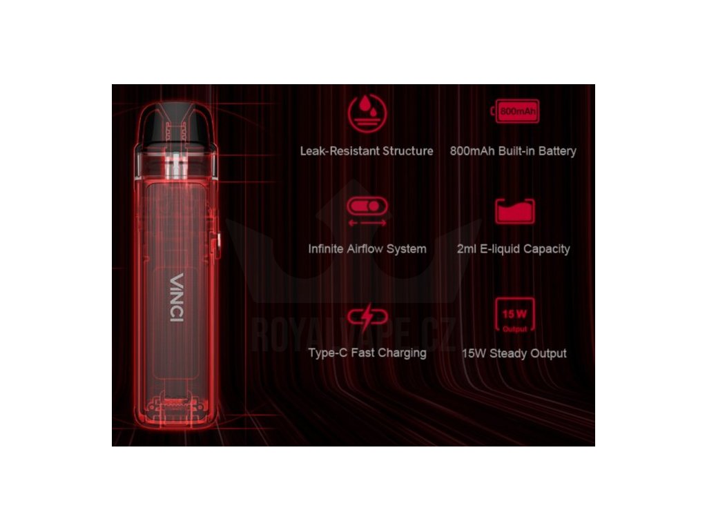Trefa do černého! VOOPOO představuje elektronickou cigaretu VINCI Pod s dokonalými kompaktními tvary, skvělou kouřivostí a autentickou chutí liquidu. Ergonomické tělo ze slitiny zinku a s designovým panelem obsahuje integrovanou baterii o kapacitě 800mAh se stylovým LED indikátorem stavu nabití (viz obrázek), automatickým spínačem a výkonem až 15W. USB-C port zajistí rychlé nabití baterie. Vyměnitelná cartridge (POD) o objemu 2ml a odporu 0,8ohm disponuje pohodlným bočním plněním. Regulace přívodu vzduchu pro nastavení optimální kouřivosti se nachází na boční straně těla baterie.